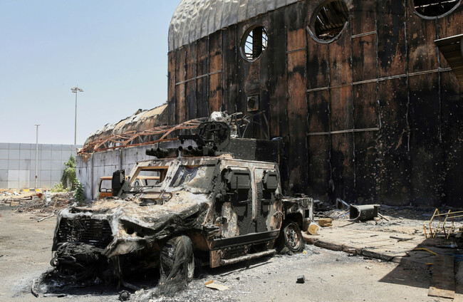 A burned military vehicle sits at Khartoum international airport a day after it was recaptured from the paramilitary Rapid Support Forces last month. AP