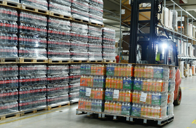 A forklift truck and pallets with bottles are pictured in the distribution centre of the Coca-Cola production facility in Genshagen, Germany, DPA/PA Images