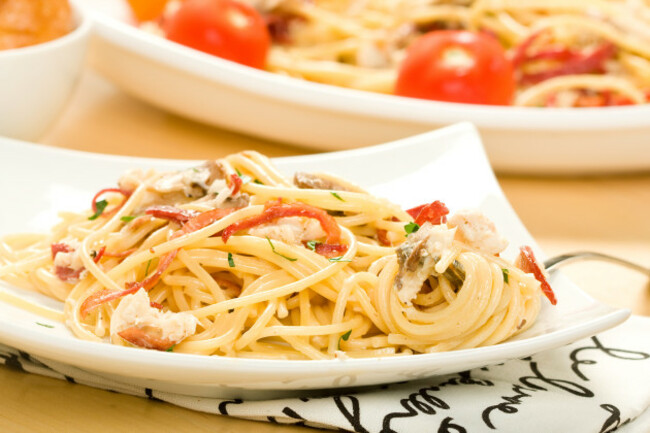 Put your spaghetti on and fry two finely chopped cloves of garlic and one chilli in a couple of tablespoons of olive oil. Add your crab with lots of flat leaf parsley and chives. Stir through the pasta.