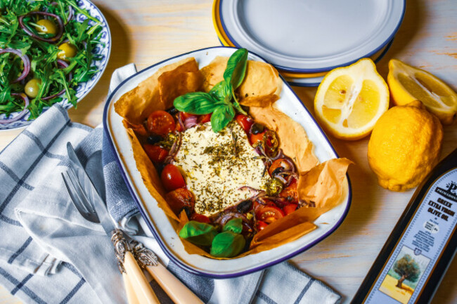 Line a small baking dish with greaseproof paper or foil and place the feta in the centre, surrounded by the onions, the cherry tomatoes and the fresh oregano.