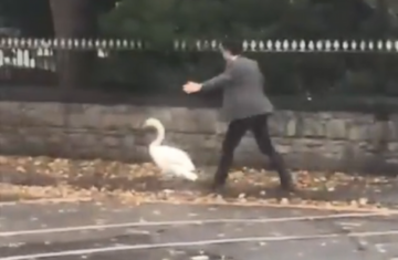On his way to RTÉ studios for the Ray D’Arcy show, the star of Channel 4′s ‘Supervet’ left his taxi, outstretched his arms and corralled the cob onto the pavement before taking his jacket off and carrying the confused bird back to the Grand Canal.