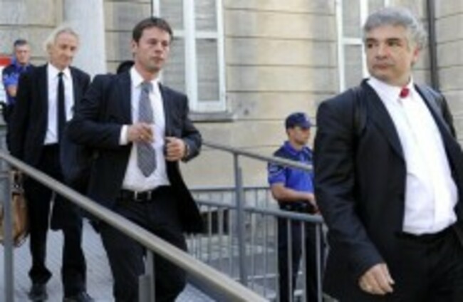 The attorneys of the three eco-anarchists leave the federal criminal court in Bellinzona, Switzerland, Friday, 22 July 2011. AP Photo/Keystone/Karl Mathis