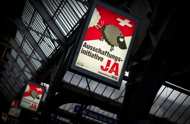 Posters in favour of the referendum at a Zurich train station show a black sheep being kicked off the Swiss flag by a white sheep.