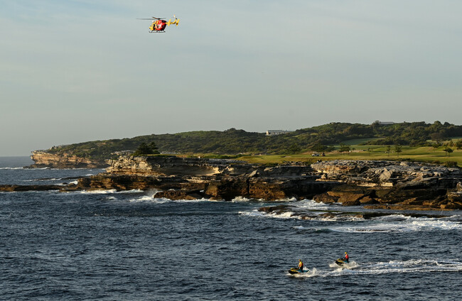 A helicopter and jet skis search the water off Little Bay Beach in Sydney today. AAP/PA Images