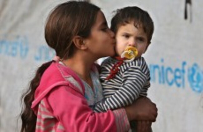 A Syrian displaced girl kisses her younger brother at one of the Syrian refugee camps at Delhamiyeh village in the Bekaa valley in Lebanon. Hussein Malla/AP/PA