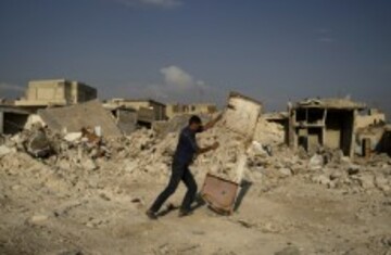 A Syrian man pushes a door away from the rubble of houses destroyed in a government airstrike, in the Syrian town of Azaz on Friday. Muhammed Muheisen/AP/Press Association Images