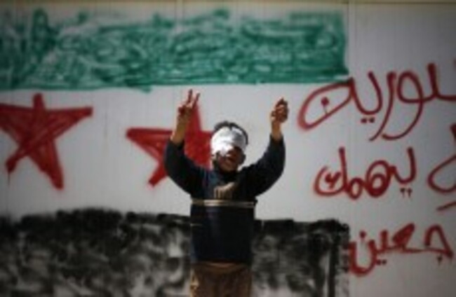 A 10-year-old Syrian refugee makes a victory sign in front of a wall at Zaatari refugee camp in Jordan AP Photo/Mohammad Hannon