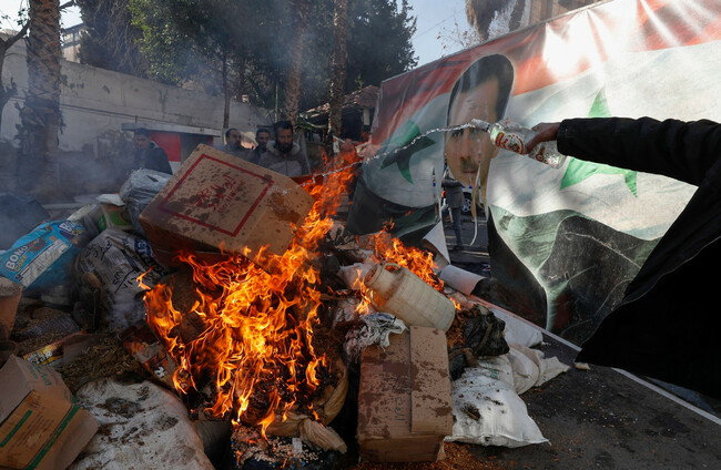 A banner with an image depicting the ousted Syrian President Bashar Assad is set the fire yesterday in Damascus. Alamy
