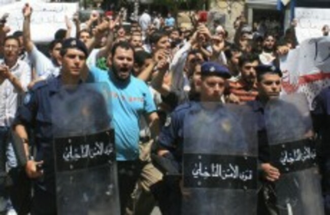 Lebanese riots police officers march in front of anti-Syrian president Bashar Assad protesters, during a demonstration against the Syrian regime, in Tripoli, northern Lebanon, on Friday June 10, 2011. Press Association Images