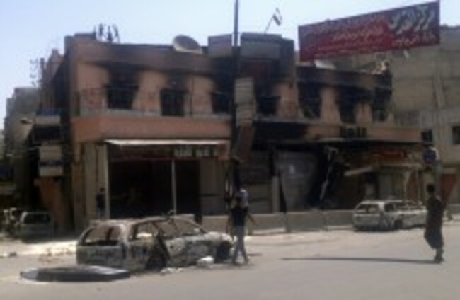 This citizen journalist image shows people walking past a gutted police station flying the Syrian revolutionary flag after fighting between rebels and Syrian troops in the Yarmouk camp for Palestinian refugees in south Damascus, Syria Anonymous/AP/Press Association Images