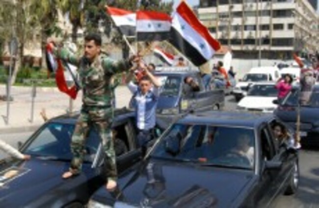 A Syrian soldier waves Syrian flags during a pro-Assad demonstration in Damascus yesterday. AP Photo/Muzaffar Salman