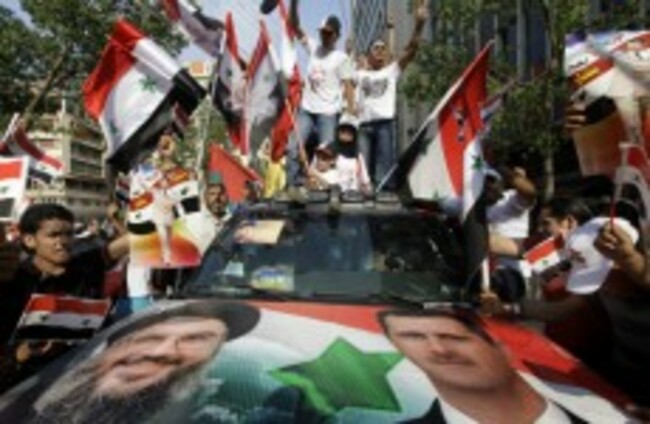 Syrian protesters carry flags and shout pro-government slogans during a rally outside the Syrian embassy in Beirut on 24 July 2011. AP Photo/Bilal Hussein