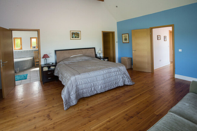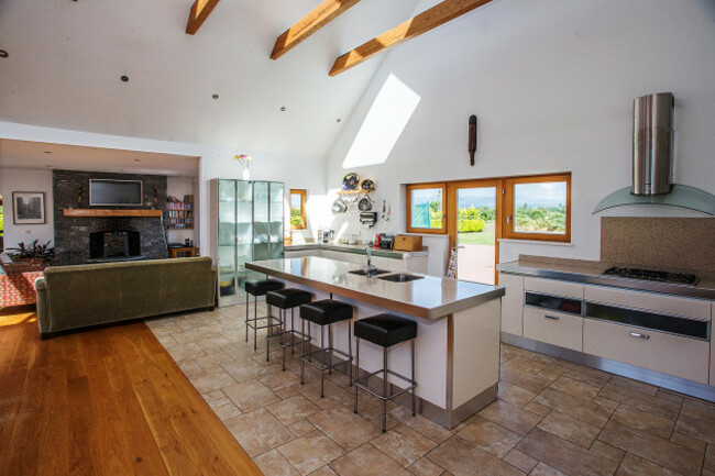 The house has a stone facade, a feature arched-glass entrance to the living room, five bedrooms, which are all en-suite, a BER rating of B3, and geo-thermal underfloor heating. The open-plan kitchen/living room/dining room has a large stone fireplace with fitted stove and dual aspect glazing.