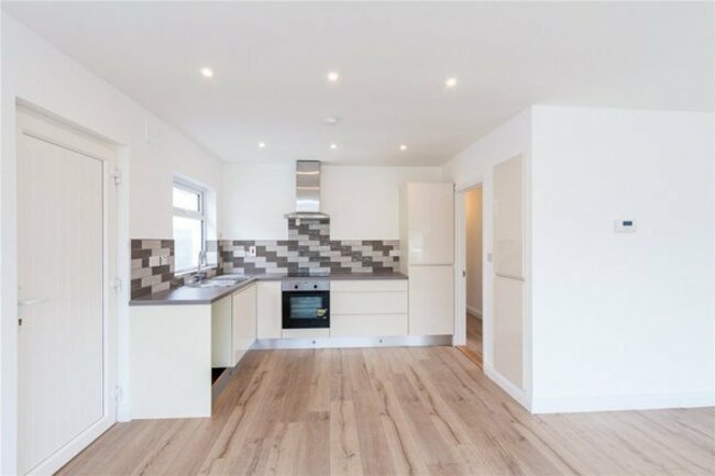 The house has a fitted high-gloss kitchen with integrated features, a large living room, three double bedrooms and a family bathroom. There are solar panels to help with water heating, oil-fired central heating and a garage.