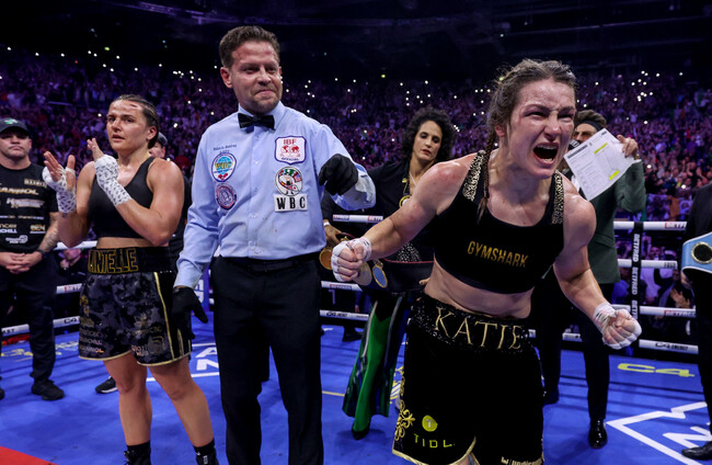 katie-taylor-is-declared-the-winner Taylor celebrates. Matchroom Boxing / Mark Robinson/INPHO Matchroom Boxing / Mark Robinson/INPHO / Mark Robinson/INPHO