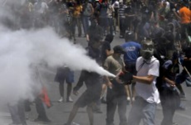 A protester uses a fire extinguisher against riot police during a demonstration in Athens today AP Photo/Petros Giannakouris