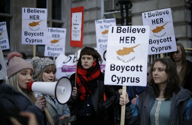 Protesters in London yesterday demonstrating in support of the British women found guilty in Cyprus. Matt Dunham
