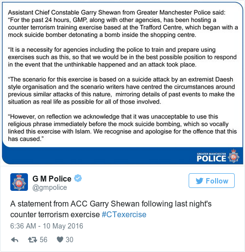 Greater Manchester Police swiftly responded to the incident, saying that the “exercise is based on a suicide attack by an extremist Daesh-style organisation and the scenario writers have centred the circumstances around previous similar attacks of this nature.”