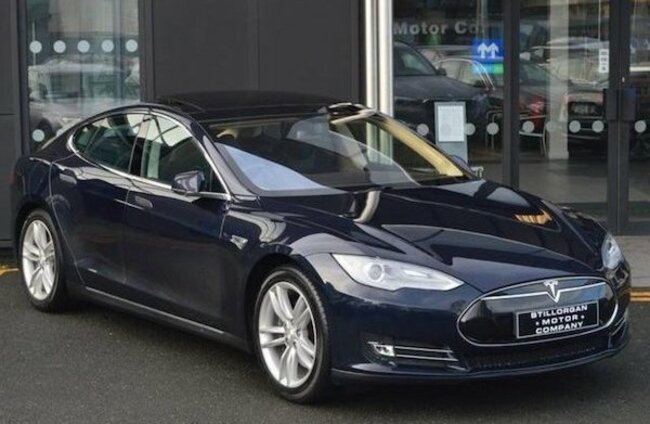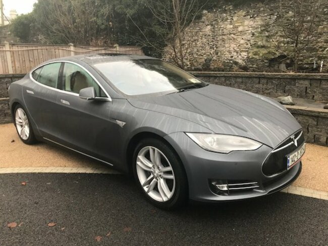 This is the Tesla Model S 85 version: a rear-wheel drive Model S powered by an 85kWh battery. It has a claimed 460km one-charge range, a 0-100km/h time of 5.6 seconds and a top speed of 225km/h. This model is very well specced and features the gorgeous panoramic sunroof.