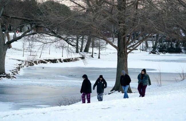 People walk along the edge looking at the frozen lake at Cottonwood Park in Richardson, Texas AP/PA Images
