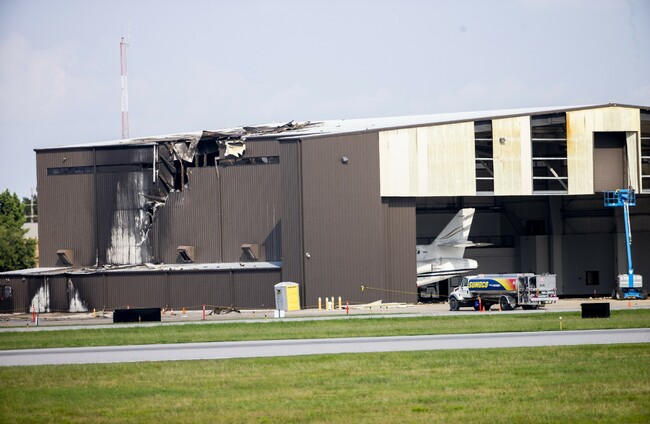 Damage is seen to a hangar after a twin-engine plane crashed into the building at Addison Airport in Addison, Texas, Shaban Athuman/PA Images