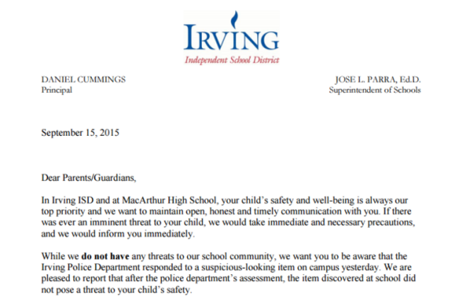 This letter was also sent out to parents of children at Irving MacArthur High School: