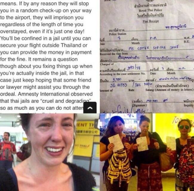 Due to a mix-up the girls had accidentally over-stayed their visa in Thailand by seven days, something the airport authorities didn’t take kindly to. They were slapped with an on-the-spot fine of 10,500 baht (500 baht each per day), the equivalent of €300, and told that if they couldn’t pay they’d be taken to a police station and prosecuted.