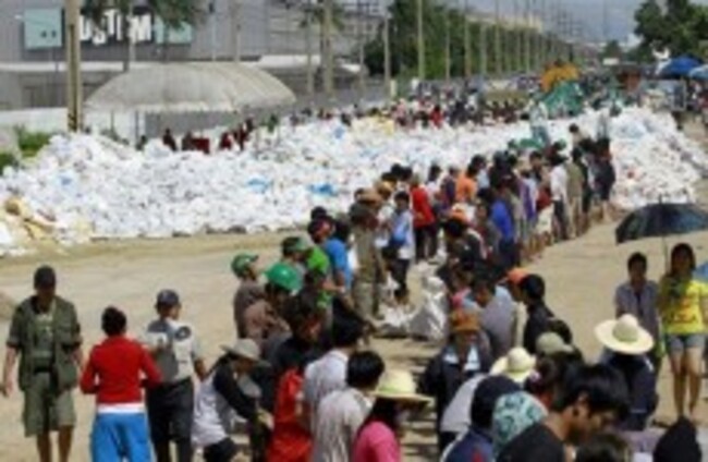 Factory workers join hands in stacking sandbags to make flood barriers at Nawa Nakorn industrial district on the outskirts of Bangkok, Thailand Sunday, Oct. 16, 2011. AP Photo