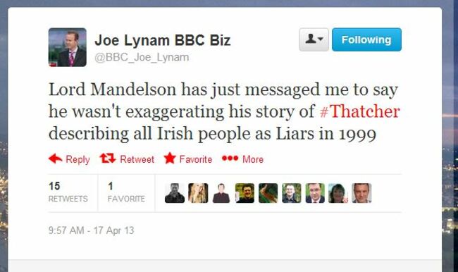 BBC journalist Joe Lynam on a message he received from Peter Mandelson this morning