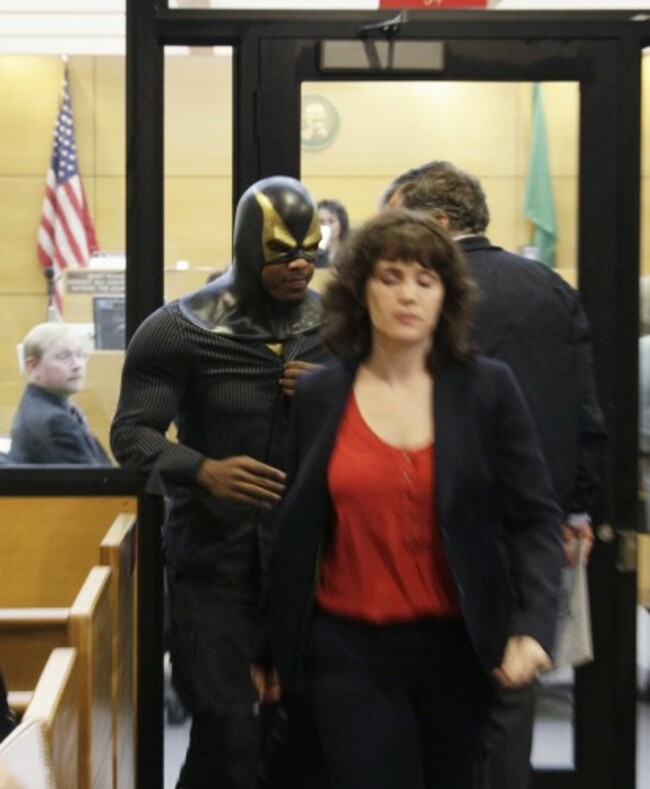 9. #UNMASKED: A ‘superhero’ who calls himself Phoenix Jones appeared in court yesterday to fight allegations he (real name Benjamin John Francis Fodor) broke up a fight using pepper spray. The Seattle Times reports that Jones/Fodor left court yesterday vowing to continue fighting crime. Here he is leaving court yesterday: