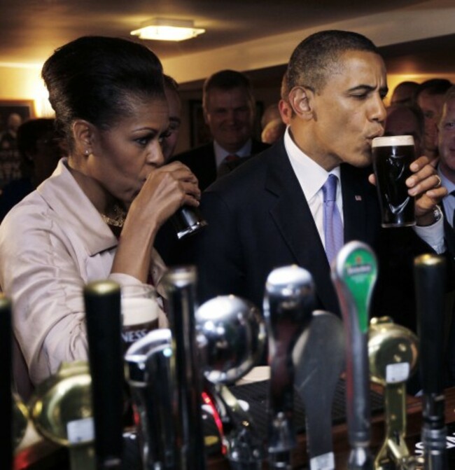 US President Barack Obama and first lady Michelle Obama drink Guinness beer as they meet with local residents at Ollie Hayes pub in Moneygall, Ireland, the ancestral homeland of his great-great-great grandfather, Monday, 23 May, 2011. (AP Photo/Charles Dharapak)