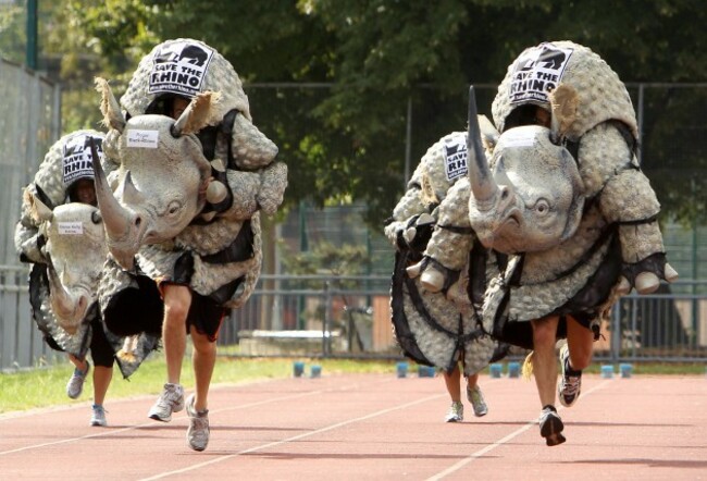 The runners are dressed in rhino costumes to take part in a 100 metre sprint, organised by Save the Rhino International, at Mile End Park, east London. The aim was to highlight the work of the charity, which conserves populations of critically endangered rhinos in Africa and Asia.