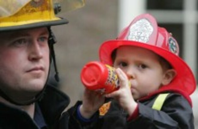 Glen Delves with his two-year-old son Caden at a protest outside the Dáil, organised by the Irish Fire and Emergency Service Association, to highlight the "huge levels of wastage" in the fire service and the level of cutbacks which are taking place. Eamonn Farrell/Photocall Ireland