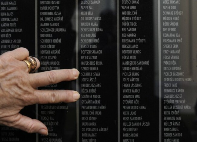 Holocaust surviver Eva Szirtes points onto names of her father Andor Schaeffer and her uncle Istvan Schaeffer on a memorial wall holding the engraved names of tens of thousands of Hungarian Holocaust victims in the Holocaust Memorial Center during the United Nations Holocaust remembrance day in Budapest, Hungary, Friday, 27 January, 2012.