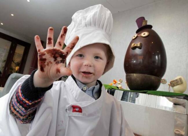 It’s Easter soon. That means goodbye to Lenten promises and hellloooooo to CHOCOLATE. Image: Three-year-old James Ross from Dublin having some fun at the Dylan Hotel earlier today. (Mark Stedman/Photocall Ireland)
