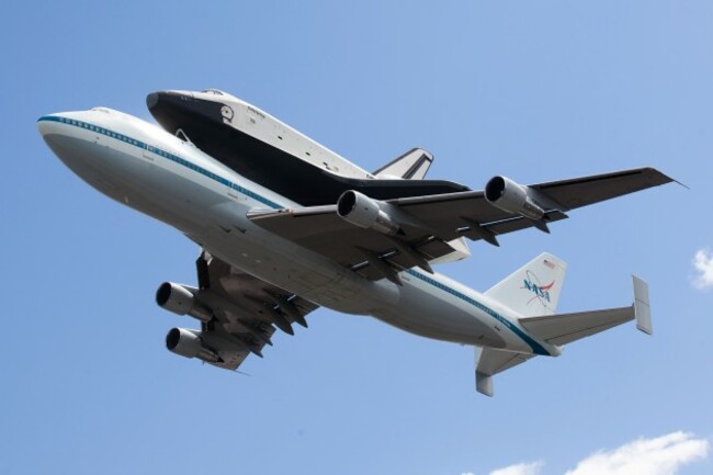 Space shuttle Enterprise, riding on the back of the NASA 747 Shuttle Carrier Aircraft flies over JFK International Airport, Friday, April 27, 2012. Enterprise is eventually going to make its new home in New York City at the Intrepid Sea, Air and Space Museum. (AP Photo/John Minchillo)