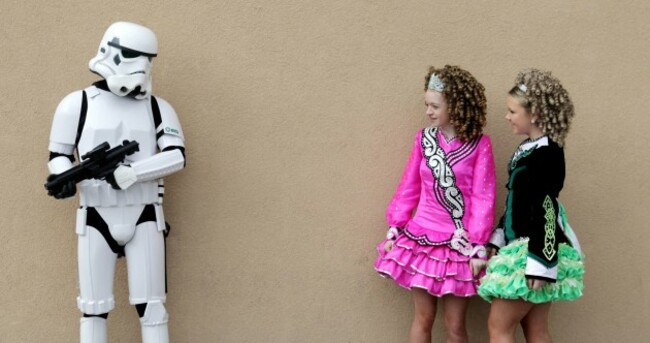 Irish dancers Sarah Duggan, 13, (left) and Shannon Tone, 14, comes across a Storm Trooper at the Citywest Convention in Dublin today Niall Carson/PA Wire/Press Association Images