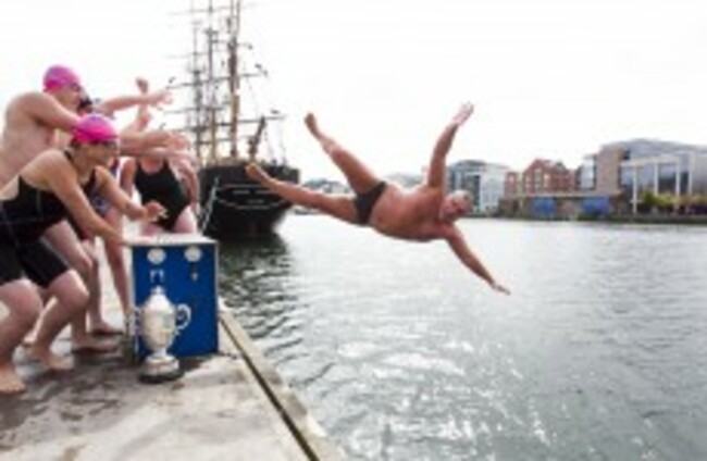 2010 Liffey Swim winner Brian O'Dwyer is pushed into the river during today's announcement of this year's race. Leon Farrell/Photocall Ireland