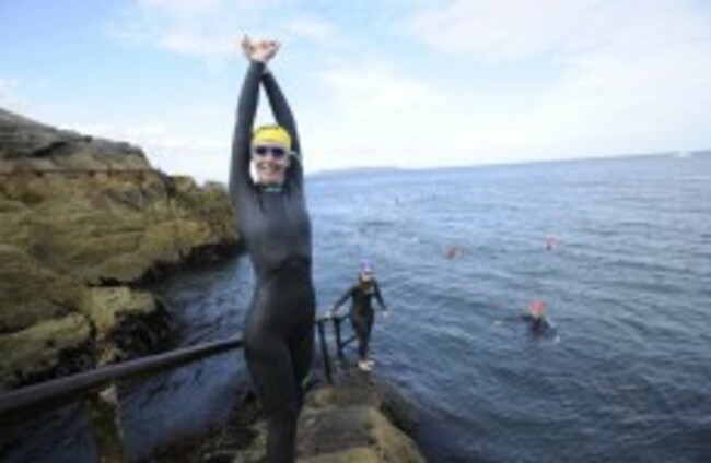 (Left to right) Jennifer O'Carroll, Catherine Galvin and Lorna McDermott, who are part of the teachers and students Triathlon team in Harold's Boys School in Dalkey, Dun Laoghaire get ready for a swim in Sandycove. Sasko Lazarov/Photocall Ireland
