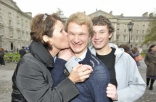 Myles McCormack from Rathmines, one of Trinity College's new scholars, is congratulated by his mother Philippa and brother Conor in the front square of Trinity College today. Sasko Lazarov/Photocall Ireland