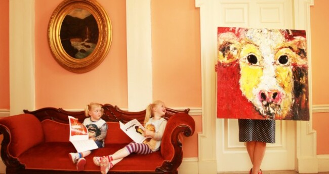 Irish artist Deborah Donnelly holds one of her paintings while watched by her children during the launch of a new series of books aimed at painting enthusiasts. Leon Farrell/Photocall Ireland