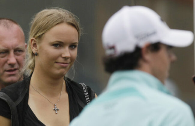 Tennis player Caroline Wozniacki of Denmark, left, watches her boyfriend Rory McIlroy of Northern Ireland, right, after McIlroy finishes the 18th green during the third round of the HSBC Champions golf tournament in Shanghai, China Saturday, 5 November 2011.