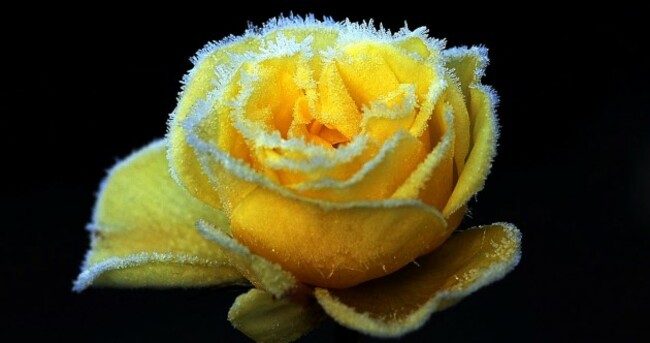 An overnight frost covers a rose bloom in a garden in York, as roses continued to bloom through the mild winter weather across parts of the UK. John Giles/PA Wire/Press Association Images