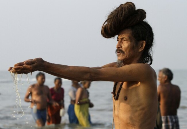 A Hindu holy man offers prayers at Gangasagar, on Sagar Island, the confluence of River Ganges and Bay of Bengal, about 140 kilometres south of Kolkata, India, Saturday, 14 January, 2012.