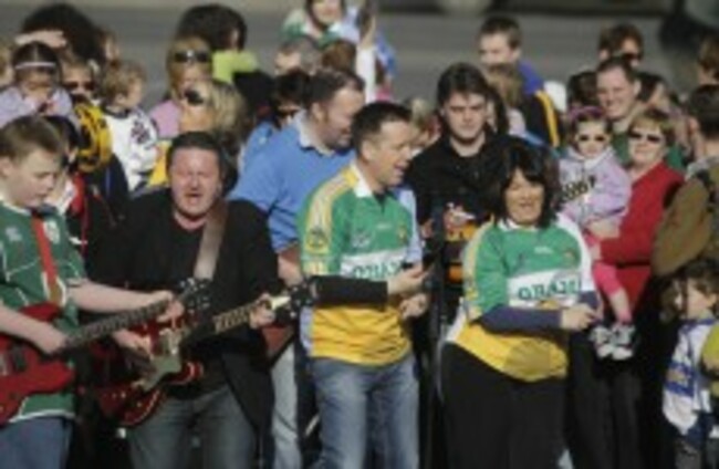 Ger Corrigan (2nd left) and RTÉ presenter Derek Mooney (centre) direct the residents of Moneygall as they shoot the music video for the Corrigan Brothers' new song, 'Welcome Home President Barack Obama', yesterday. Niall Carson/PA Wire
