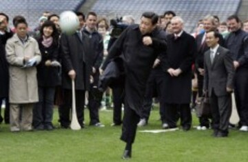 He didn't tog out, but Chinese vice-president Xi Jinping still gave the ball a fair old whack at Croke Park earlier today. Mark Stedman/Photocall Ireland