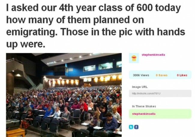 • Economist and UL lecturer Stephen Kinsella captured this worrying image of one of his classes earlier today. Those with their hands up are signalling they plan to emigrate – about 50 to 70 per cent of the class, he says: