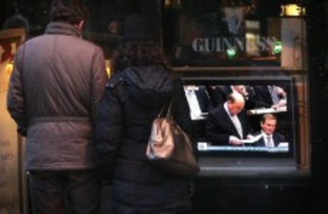 A couple stop to watch a television outside a pub in Dublin as Finance Minister Michael Noonan delivers the budget Niall Carson/PA Wire/Press Association Images