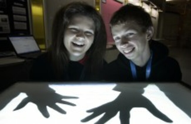 Science! Caoimhe Barnes (17) and Ian Harrison (18) set up their exhibition on a multi-touch computer at the BT Young Scientist exhibition in the RDS. Mark Stedman/Photocall Ireland