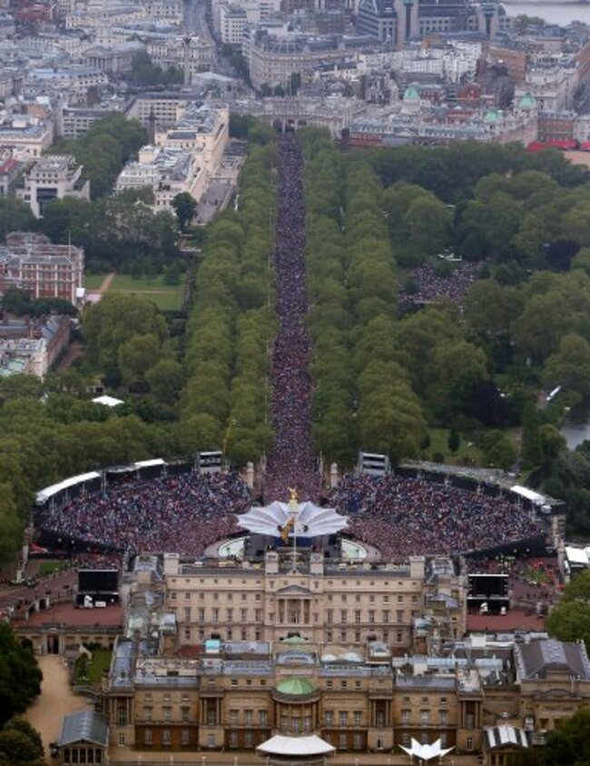Crowds gather on The Mall around Buckingham Palace in London today as the Queen’s Diamond Jubilee celebrations drew to a close with an impressive flypast. It’s been quite a four days for Her Majesty which included meeting celebs in funny clothes last night. (Peter Macdiarmid/PA Wire/Press Association Images)